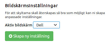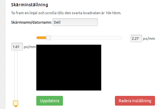 Här ser du "Skärminställningar", där du tar upp en linjal och ställer in så att den svarta fyrkanten är exakt 10x10cm. Spara detta och dina skyltar kommer att visas i rätt storlek på din skärm.